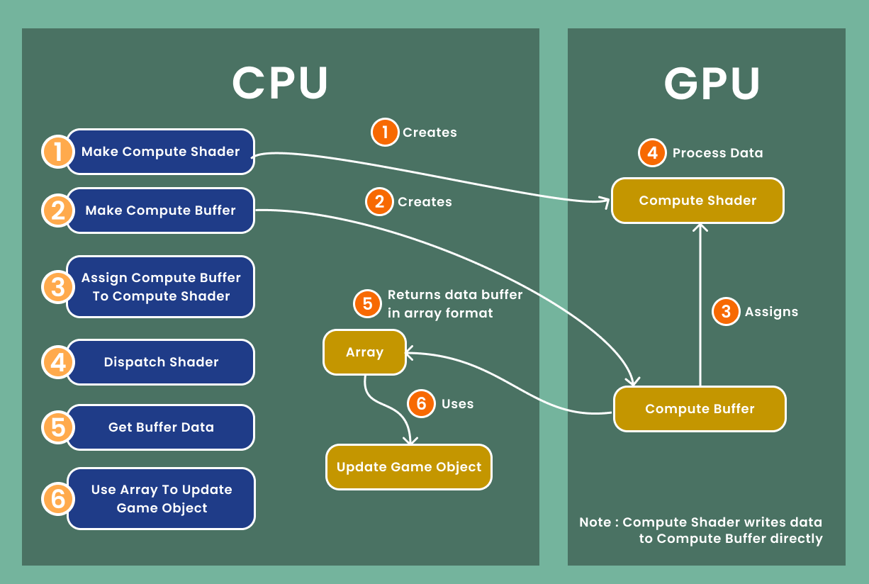Berbeda dengan Shader tersebut, Compute Shader digunakan untuk melakukan komputasi secara umum. Compute Shader tidak mempunyai input parameter atau output parameter sehingga untuk mempunyai input atau output digunakan Compute Buffer. Setelah kita melakukan pemrosesan data di Compute Shader, kita dapat mengambil data dari buffer dalam bentuk array sehingga dapat digunakan oleh CPU. Berikut merupakan flowchart atau diagram yang menjelaskan cara kerja pembagian kerja di GPU yang akan kita kerjakan nanti.
