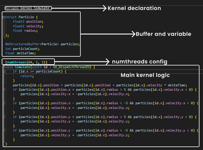 Kernel declaration digunakan untuk mendefinisikan fungsi yang akan dijadikan kernel untuk dipanggil oleh CPU. Selanjutnya ada buffer dan variable, disini kita mendefinisikan apa buffer yang digunakan, variable yang digunakan, dll. StructuredBuffer tersebut nanti akan disambungkan dengan Compute Buffer yang dibuat oleh CPU. Selain itu, perhatikan juga struct yang digunakan karena nanti pada CPU, kita harus membuat struct dengan data type yang sama. Setelah itu ada numthread, penjelasan numthread lumayan rumit sehingga akan ada paragraf sendiri nantinya. Terakhir ada main kernel logic, main kernel logic akan berisi semua pemrosesan data yang akan digunakan. Disini kita mempunyai logic yang sama dengan yang ada di CPU. Hasil simulasi ini akan langsung diganti di buffer particles, sehingga nanti bisa diambil oleh CPU.