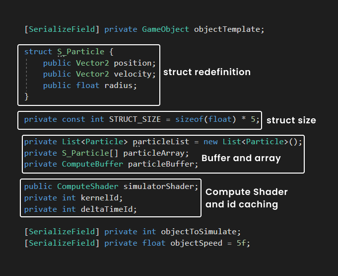 Disini, terdapat definisi struct yang ada di compute shader sebelumnya. Selanjutnya ada struct size, ini adalah besar struct dalam besaran byte. Selanjutnya dada definisi buffer dan array, disni list digunakan untuk menyimpan data dengan referensi ke particlenya, array digunakan untuk mengatur data buffer dan mengambil data dari buffer. Lalu terakhir ada ComputeBuffer yang akan kita gunakan sebagai buffer di compute shader kita nanti. Lalu ada bagian ComputeShader dan id cache, disini kita dapat mereferensikan ComputeShader dari editor dan menyimpan id dari ComputeShader.