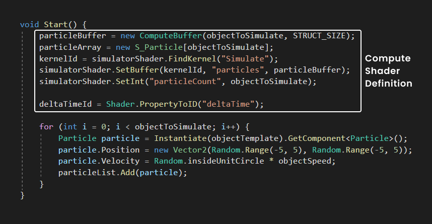 Pada fungsi start, kita akan mendefinisikan compute buffer dan arraynya. Disini kernelId dan deltaTimeId juga didefinisikan agar tidak perlu mencari idnya lagi. SetBuffer berfungsi untuk meng-assign Compute Buffer ke Compute Shader.