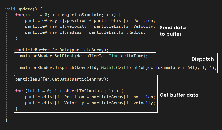 Bagian kedua dispatch bertugas untuk melakukan proses data di GPU. Sebelum itu kita mengatur waktu deltaTime update, sesuai dengan waktu yang ada di Time.deltaTime.