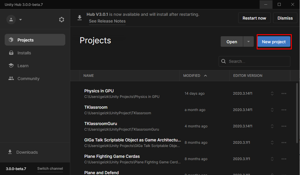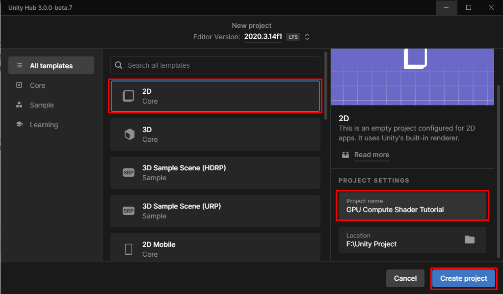 Sebelum kita belajar memindahkan pekerjaan CPU ke GPU, mari buat project terlebih dahulu. Agar project yang dibuat sederhana, maka kita akan membuat project dua dimensi saja. Untuk membuat project dua dimensi, dapat buka Unity Hub lalu klik New Project. Setelah klik New Project, pilih konfigurasi 2D dan isi Project Name lalu klik Create Project seperti pada gambar berikut.