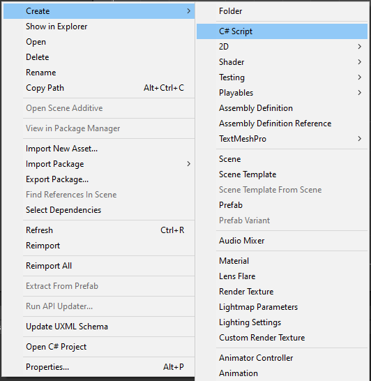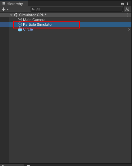 Setelah itu kita akan membuat 2 script, yang pertama adalah Particle.cs dan ParticleSimulator.cs. Kelas Particle akan berfungsi sebagai actor object yang menyimpan posisi, kecepatan dan radius. Kelas Particle Simulator akan bertugas untuk memunculkan object dan mensimulasikannya tiap frame. Untuk membuat script, klik kanan di Project View lalu Create > C# Scripts.