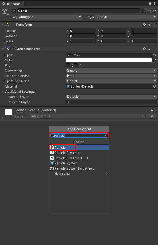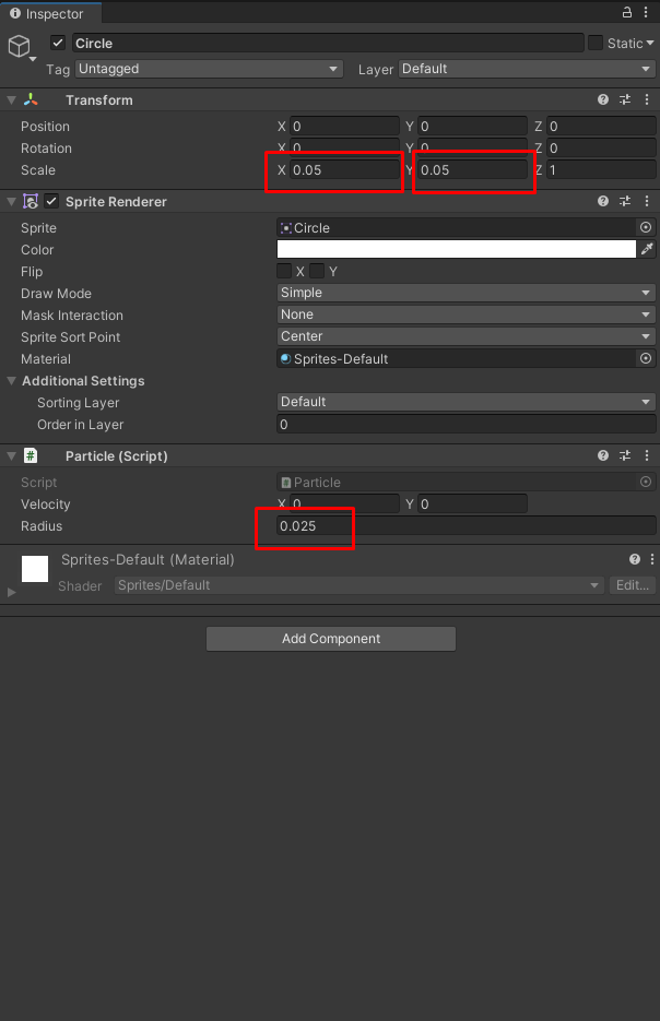 Setelah membuat kedua script, pada object circle yang ada di scene ubah ukurannya menjadi 0.05 untuk sumbu x dan y. Tambahkan juga script Particle.cs dengan properti radius diubah menjadi 0.025. Untuk menambahkan komponen (script) ke game object, pertama klik game object yang ingin ditambahkan komponen (dapat juga klik dari hierarchy). Lalu, klik Add Component dan tambahkan script Particle.