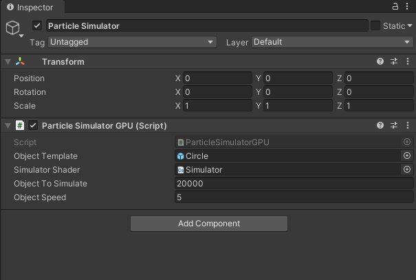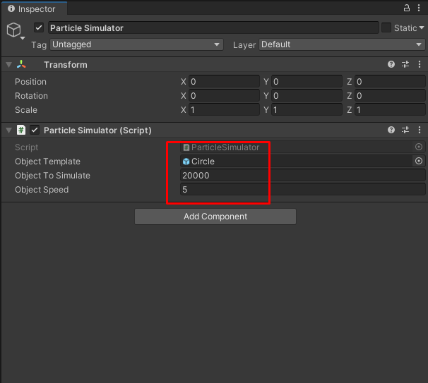 Setelah itu, buatlah objek kosong dan tambahkan script ParticleSimulator.cs. Masukkan prefab ke properti Object Template, isi Object Speed menjadi 5, dan isi Object To Simulate 10000.