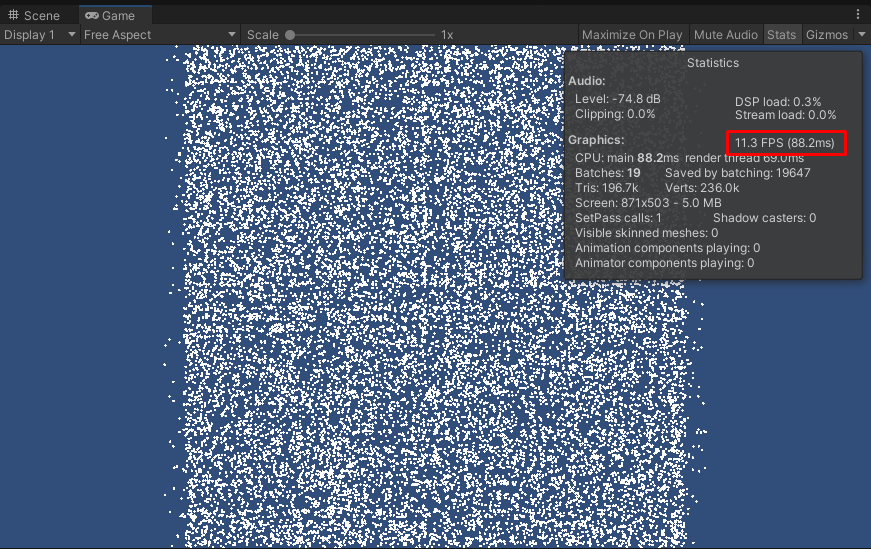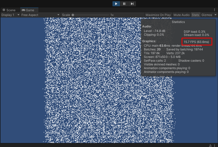 Jalankan gamenya dan lihatlah simulasi di GPU. Coba cek performa dengan membuka stats tab diatas Game View.