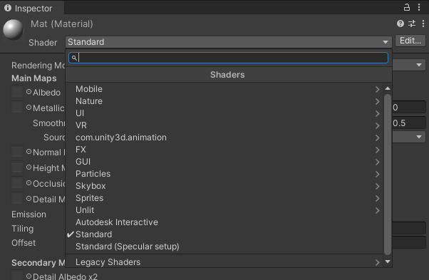 Untuk memindahkan pekerjaan dari CPU ke GPU, pertama dibutuhkan untuk membuat Compute Shader. Sebelum kita membuat Compute Shader, pertama saya akan menjelaskan apa itu Shader. Jadi Graphics Processing Unit mempunyai tugas untuk melakukan rendering grafis. Graphics Processing Unit menggunakan shader untuk mengetahui bagaimana cara untuk me-render grafis tersebut. Sebagai contoh, Unity mempunyai banyak built-in Shader seperti berikut.