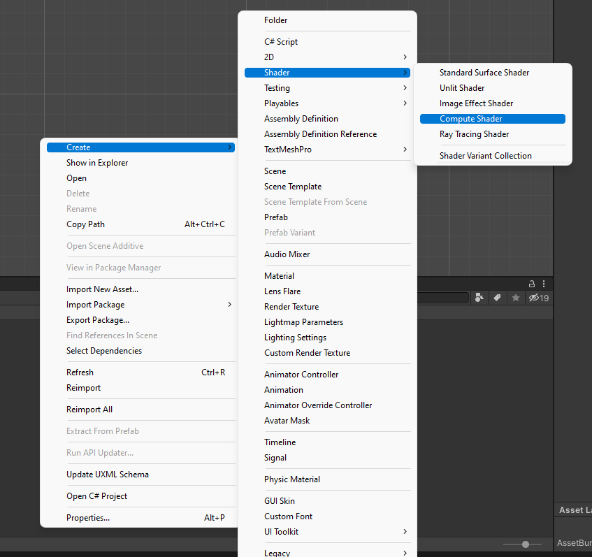 Compute Shader dapat dibuat dengan klik kanan di Project View lalu Create > Shader > Compute Shader.