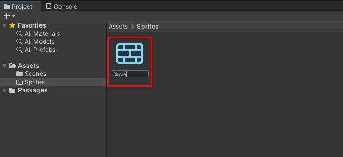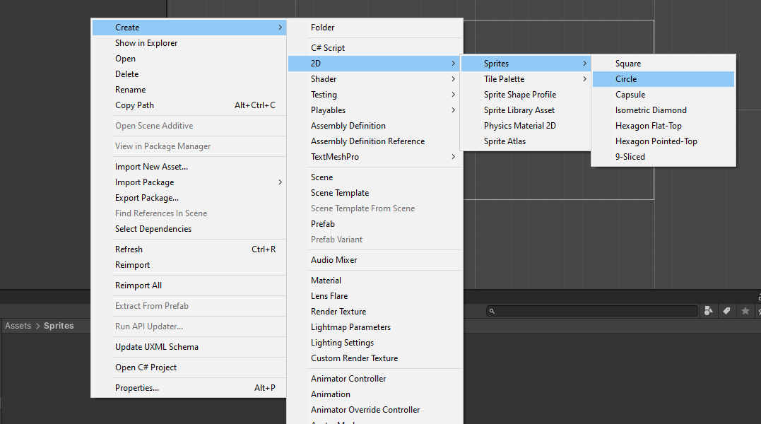 Setelah itu, masuk ke folder Sprites dan buat sprite dengan klik kanan di Project View lalu Create > 2D > Sprites > Circle. Beri nama yang sesuai, disini saya akan memberi nama “Circle” seperti pada gambar berikut.